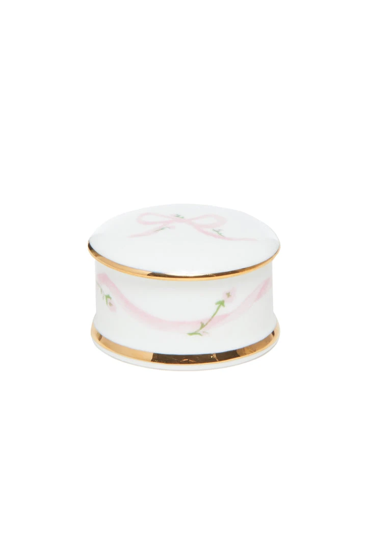 Cute as can be, this handmade porcelain small round box makes the perfect home for trinkets and treasures. Made in the English Countryside by The Present Company. Shown here in Pink Bow.