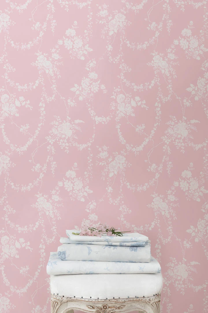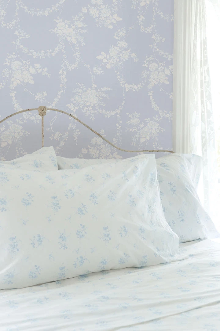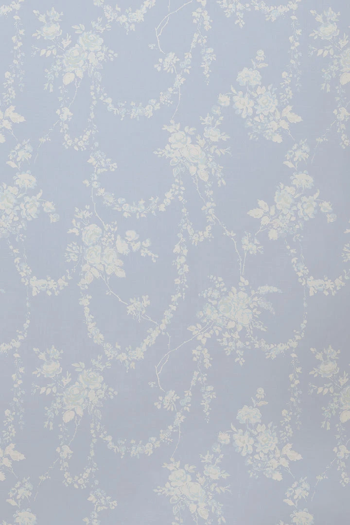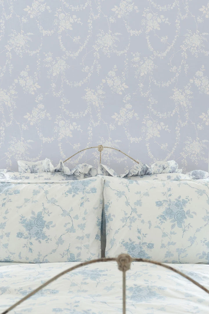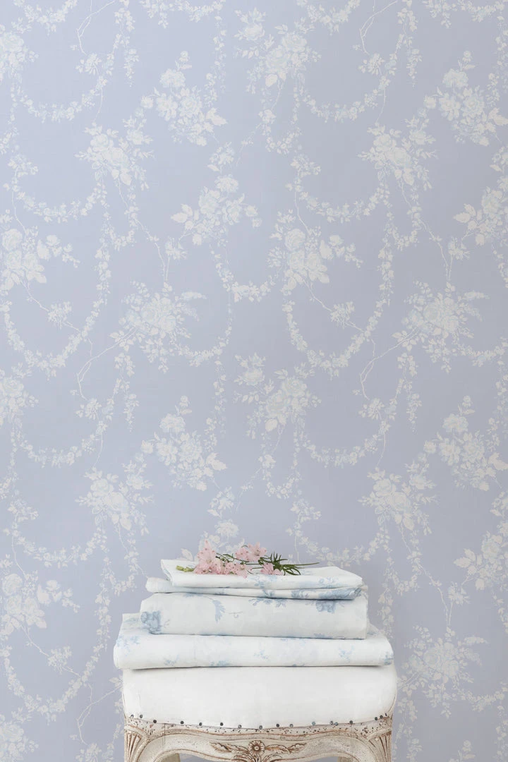Bring elegance and enchantment to your walls with this romantic botanical wallpaper. Delicate drapes of flowering garland are anchored by voluminous rose clusters, all detailed in shades of white, grey and blue against a baby blue backdrop. Each roll measures 20.5” x 33′. Mix and match it with our La Vie En Rose Quilted Duvet Cover & Sham Set. Shown here in Blue Gemstone.