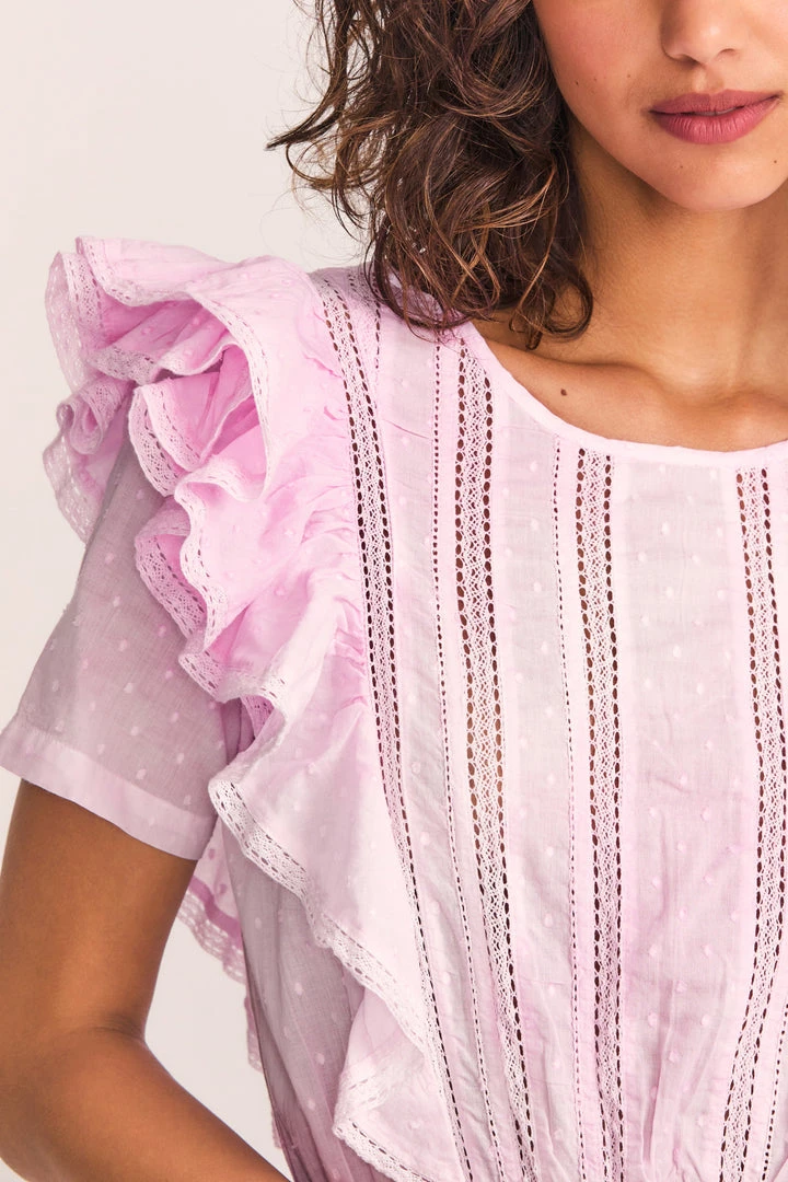Our LoveShackFancy signature Natasha dress has got an update, made with natural hand-dye using pomegranate, sea salt and madder root. Featuring double ruffled flutter sleeves which cascade down the front and back of the body to highlight the elasticated waist. Intricate inset lace trims add an air of femininity and ease. Accessorize your Natasha Mini with our LoveShackFancy x Lova The Flower Gold Earrings.