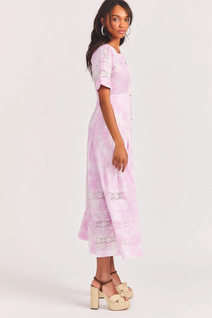 The Edie dress in cotton crochet lace features design details including an empire waist with soft pleating down to a midi-length hem. Mother of pearls buttons kiss in front from its high neckline down, while lace details adorn the sleeves and bodice. Style with black ankle strap flats, and wear it every day. Comes with a half-slip. Accessorize your Edie Midi Dress with our LoveShackFancy x Lova Dolce Vita Heart Flower Earrings.