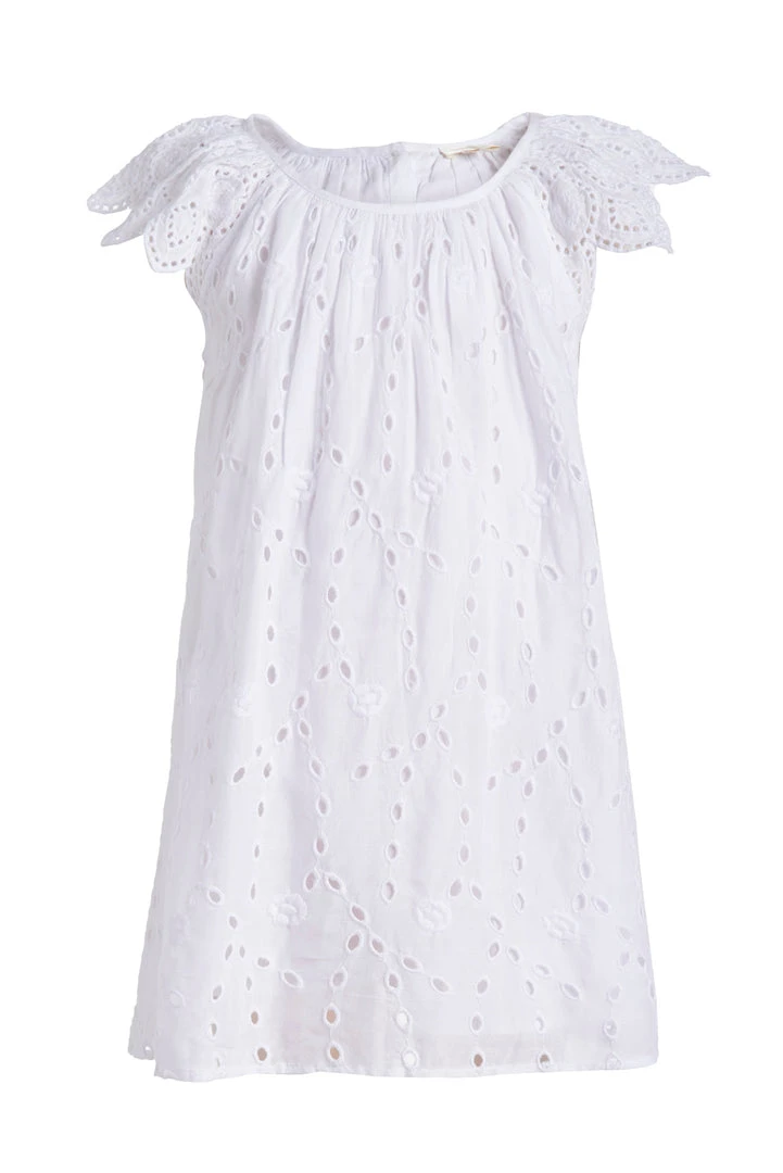 Skip along in our signature Lou Dress, reimagined in 100% cotton with custom lace and hand-embroidery. A simple shirred circle neck is framed by flutter sleeves. This sheath dress, which features buttons down center back, stops just above the knee. Accessorize it with our LSF x Lele Sadoughi Girls Pearl Headband. Shown here in Antique White.