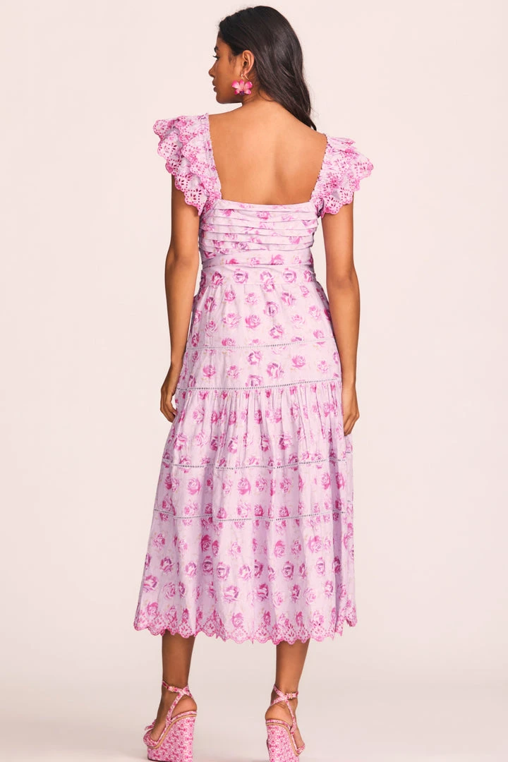 Our Harlyn Dress is timeless in 100% cotton with our hero hand-painted rose print of the season, eyelet embroidery and inset embroidered panels. This sweet empire frock has a square neckline with raw ruffle trim, a pleated bodice and double flutter sleeves with scalloped edges. The shirred skirt falls to midi-length with a scalloped hem. Pair your midi dress with our matching Lorna Barrette.