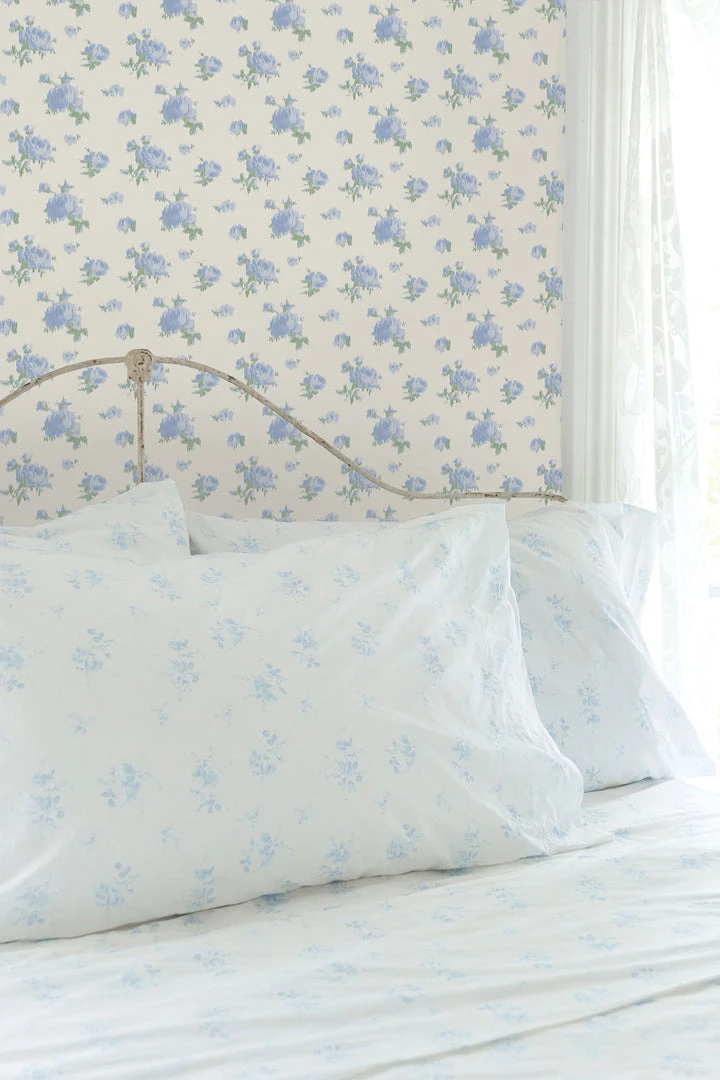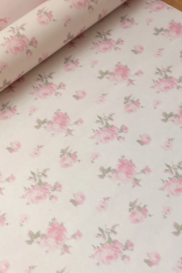 Inspired by ikat fabric, this floral wallpaper brings romantic elegance to your interiors. The pink roses and green leaves are seemingly stitched into the creamy white backdrop. Each roll measures 20.5” x 33′. Mix and match with our Pastiche De Bouquet Sheet Set and our La Vie En Rose Quilted Duvet Cover & Sham Set. Shown here in Tinted Petals.