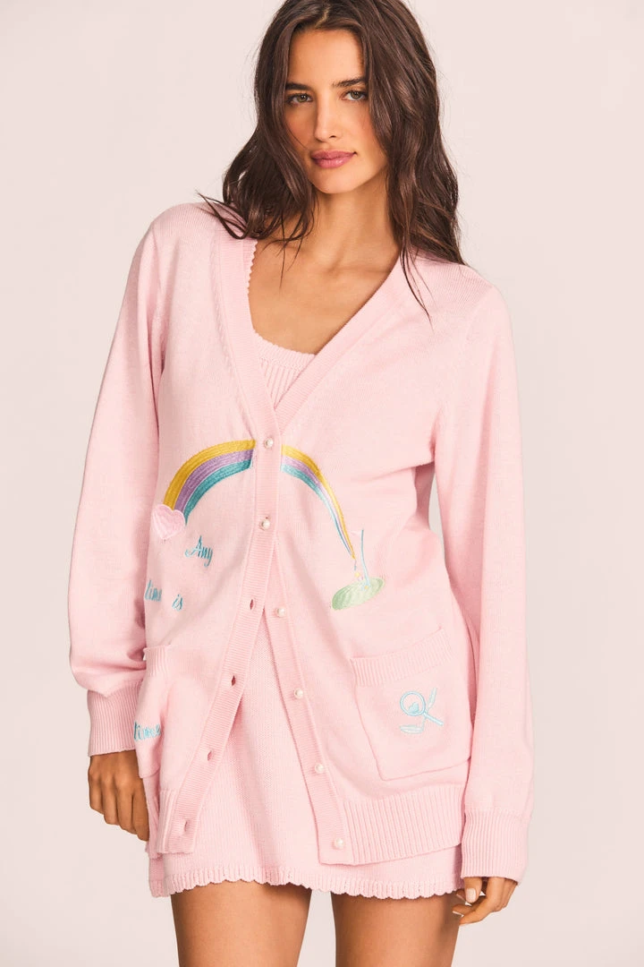 You’re a good sport in our Jura Cardigan, part of our inaugural sporty-inspired capsule. This cotton-blend sweater has a relaxed grandpa fit, a v-neck, pearl buttons down a ribbed center front placket, ribbed cuffs at sleeve opening, patch pockets and coy embroidery including rainbows and hearts, a club and racket insignia and the phrase, “Any time is tee time.” Pair it with our Indiana Dress. Shown here in Pink Sands.