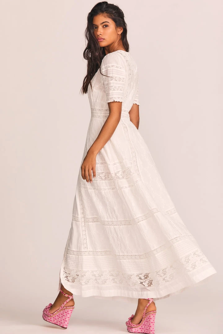 Our new Kylen Victorian Maxi is a must-have dress of the season in 100% cotton voile with schiffli embroidery, pintucking and a mix of custom embroidered and crocheted laces in geometric pattern play. This easy transitional frock has a scoop neck, mother-of-pearl buttons that descend from top to bottom and shirred shoulders above elbow sleeves. Accessorize this with our Lorna Barrette. Shown here in True White.