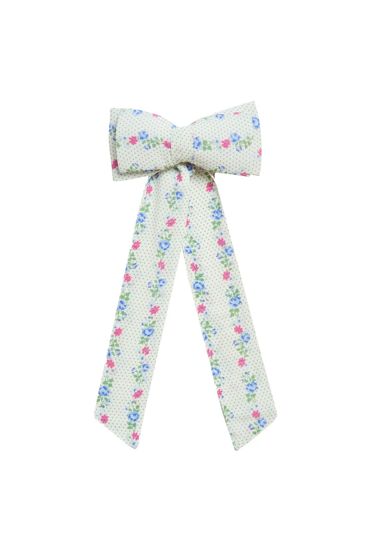 Our Lorna Barrette adds a girlish twist in silky viscose with a hand-painted print and a gold clip. This classic barrette features a smaller bow layered atop a larger one with diagonally cut ribbon peeking from beneath.