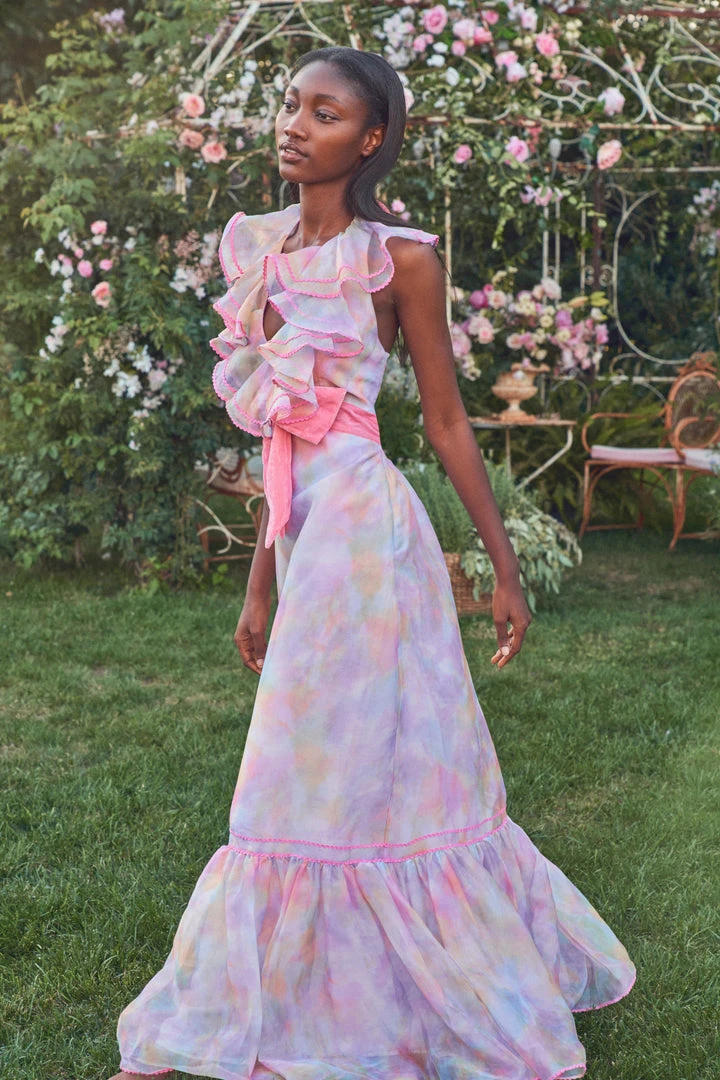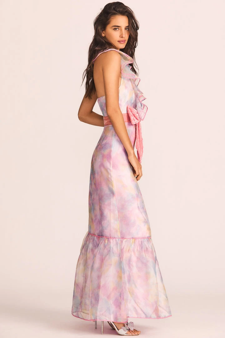 Our Maris Gown is magic in organza with a cloudy rainbow print and contrast rickrack trim detailing. This ethereal dress has a rounded v-neck, framed by a double ruffle, that fastens behind the neck with a hook-and-eye closure. A crushed velvet bow graces the empire waist at center front. Below, the skirt sweeps to a generous flounce at bottom. Accessorize your gown with our LoveShackFancy x Lova Dolce Vita Heart Flower Earrings. Shown here in Fairytale Printed.
