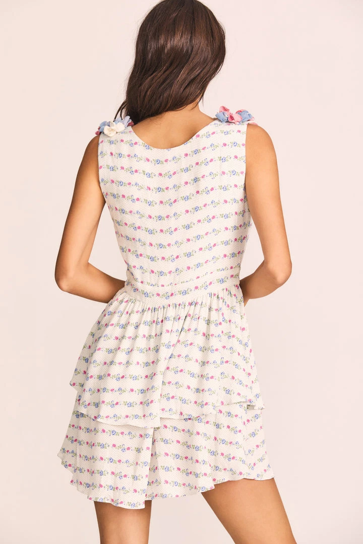 A LoveShackFancy favorite, our Shayna Dress arrives in a new viscose crepe fabric with a tossed daisy print and handmade crushed velvet flower appliqués. This festive party dress has a plunging v neckline, a fixed shaped waist and a shirred, double-tiered miniskirt. Accessorize it with our Lorna Barrette.