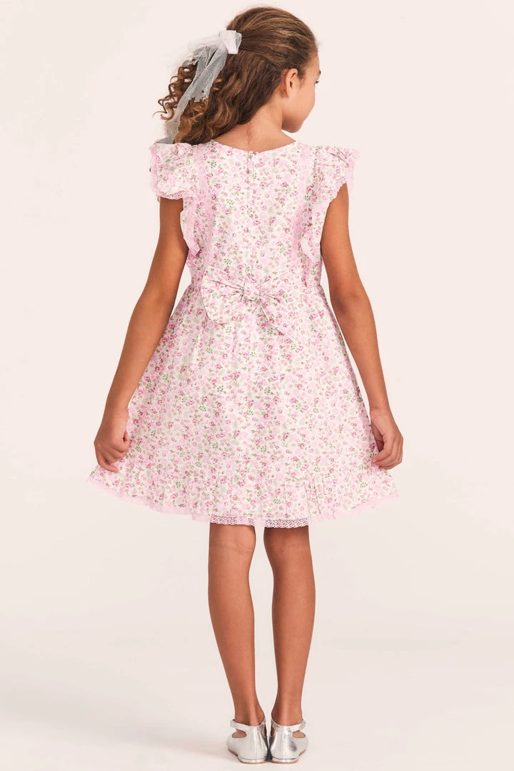 Meet our Floral Flutter Day Dress for girls in a pink floral print and custom lace. This easy-going frock has lace-trimmed flutter sleeves, a victorian-inspired high neck and a sweet ruffle finish at the skirt. Dress your doll in the matching Floral Flutter Day Dress. Shown here in Melon Drops.