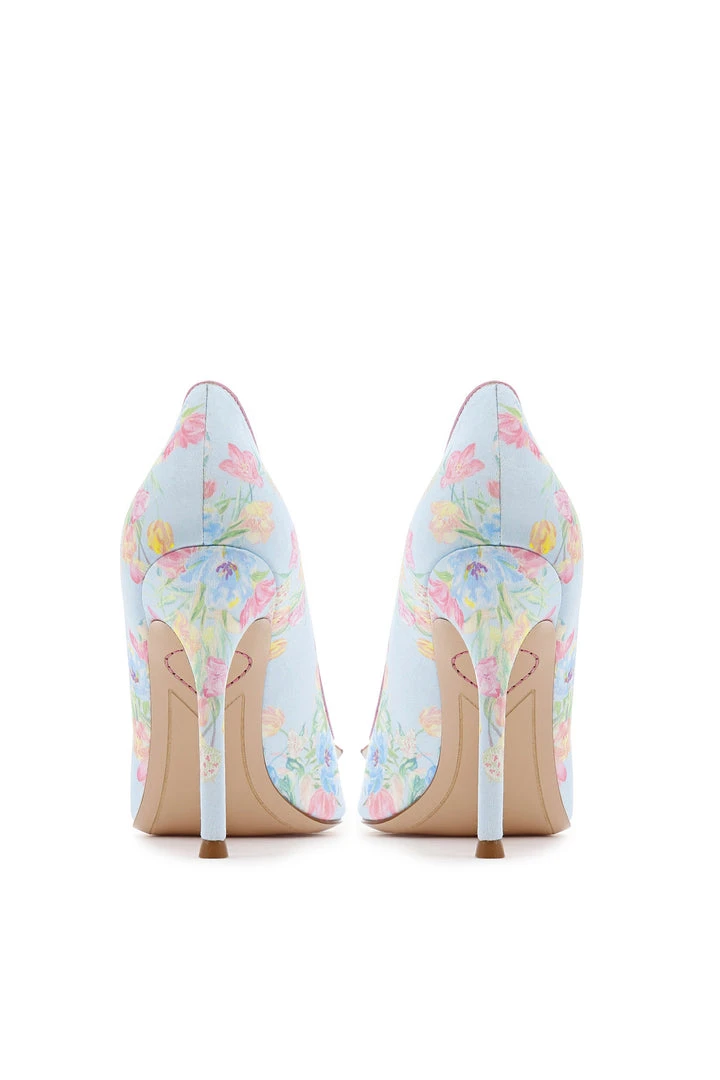 LoveShackFancy x Sophia Webster collection is here! Meet our take on Sophia Webster’s classic Margaux Pump. This modern Cinderella heel is elegantly designed with a dreamy powder blue colorway featuring hand-painted florals throughout. This shoe includes its signature, ethereal pastel rainbow Margaux buckle. Shown here in Sky Lullaby.