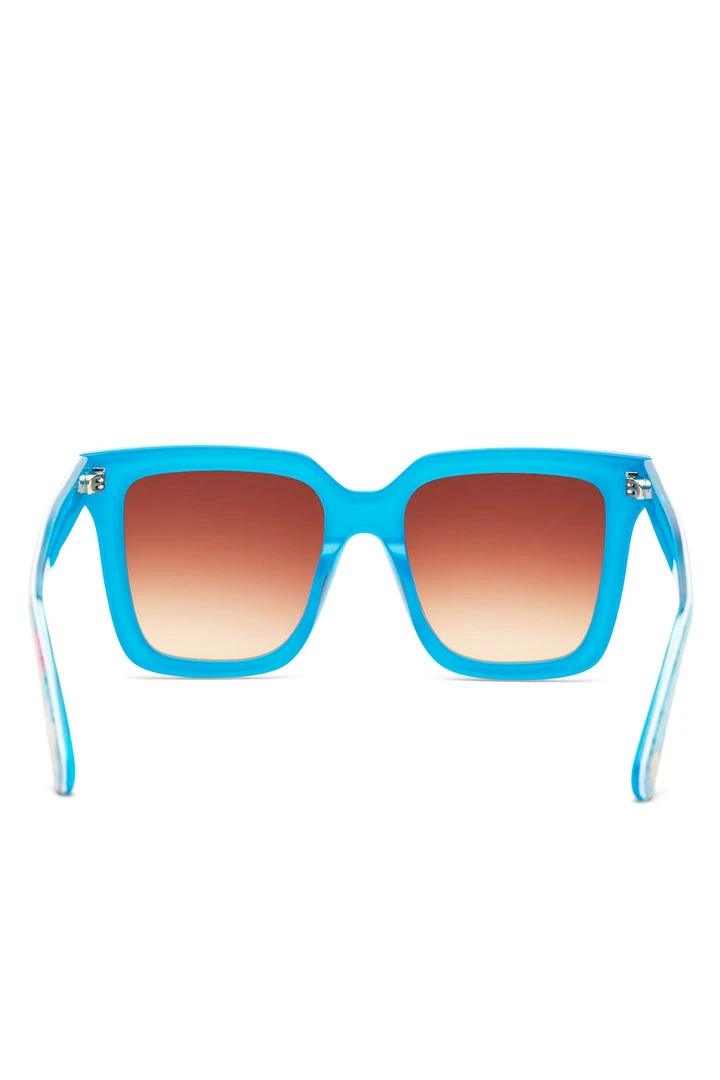Stay vacation ready in our Novella sunglasses. With epic, square frames these shades make waves with a tropical floral print amongst a turquoise base. Wear them with our Tariah Pinafore Dress. Shown here in Turquoise Waves.