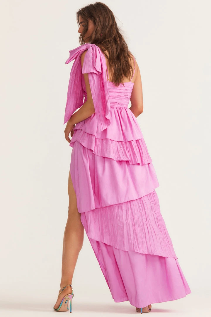 Making an entrance in our Raylene Dress. This statement, occasion piece is designed with a stunning, crinkle and flat taffeta combination. This showstopping gown features a super exaggerated high to low silhouette, a fitted bodice, a multi-tiered skirt of ruffles and a major bow at center front. Accessorize it with our LSF x Lova Dolce Vita Heart Flower Earring. Shown here in Hot Fuschia.