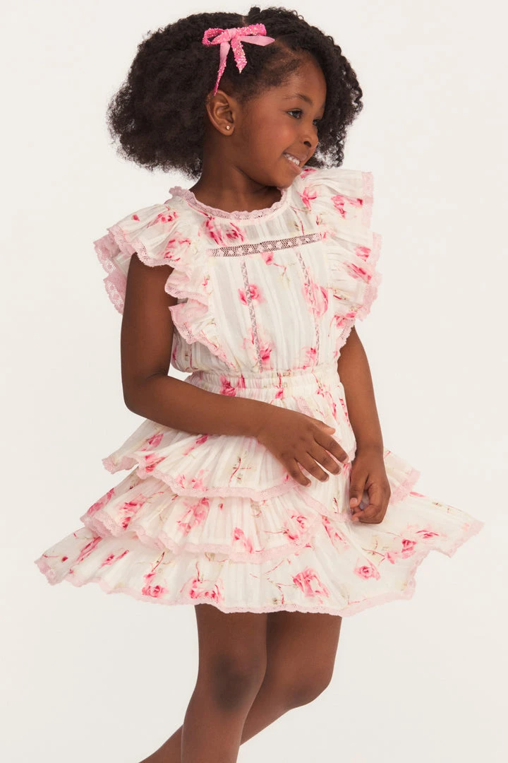 Our Decker Dress is reimagined in 100% cotton with a pretty, pink floral print and custom lace. This easy frock has a ruffle-trimmed collar, buttons down center front, flutter sleeves, an elastic waist and overlapping asymmetrical ruffles at the skirt. Accessorize it with our Lorna Barrette. Shown here in Cherry Soda.