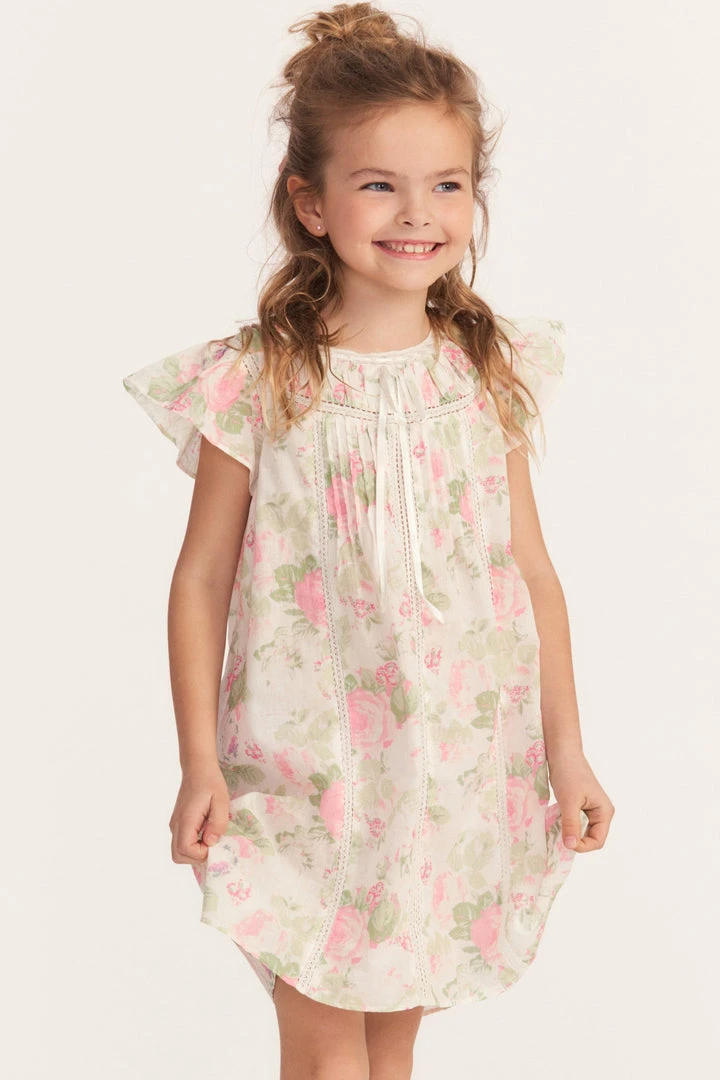 Our Flutter Sleeve Gown for girls is back in 100% cotton. This easy frock features raw-edged lace that trims the scoop neck and flutter sleeves. The bodice and back have intricate detailing like inset custom lace and pintucking.