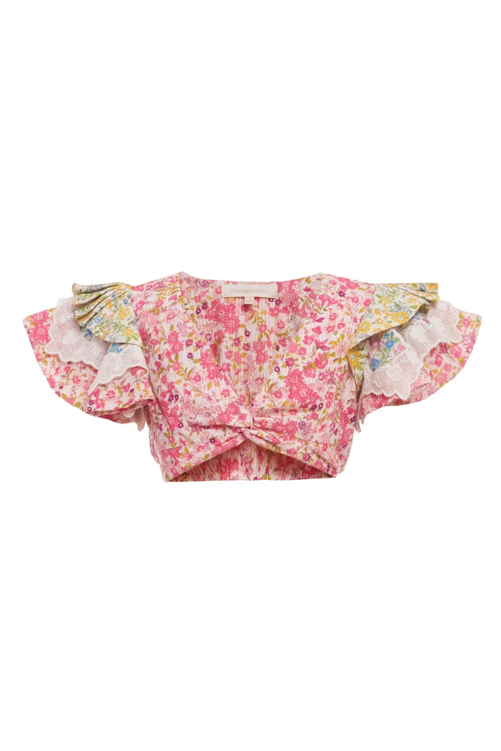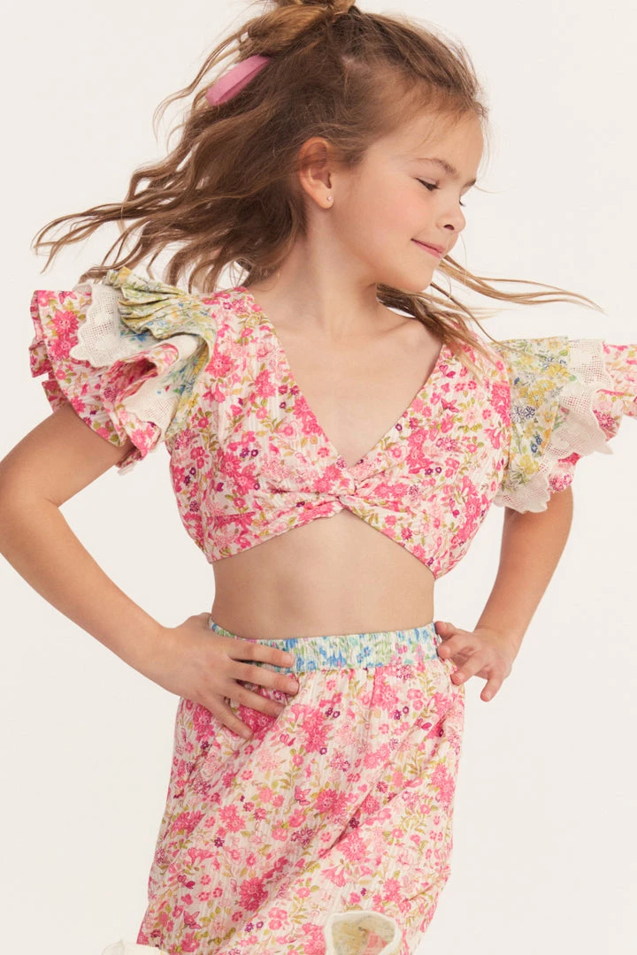 Sweet as can be in our Judy Top with a multi-colored floral print. This cutie top has a slight v-neck with a ruched center front and ruffle-adorned flutter sleeves. Wear it as a set with our Elias Skirt. Shown here in Fruity Punch Colorblock.