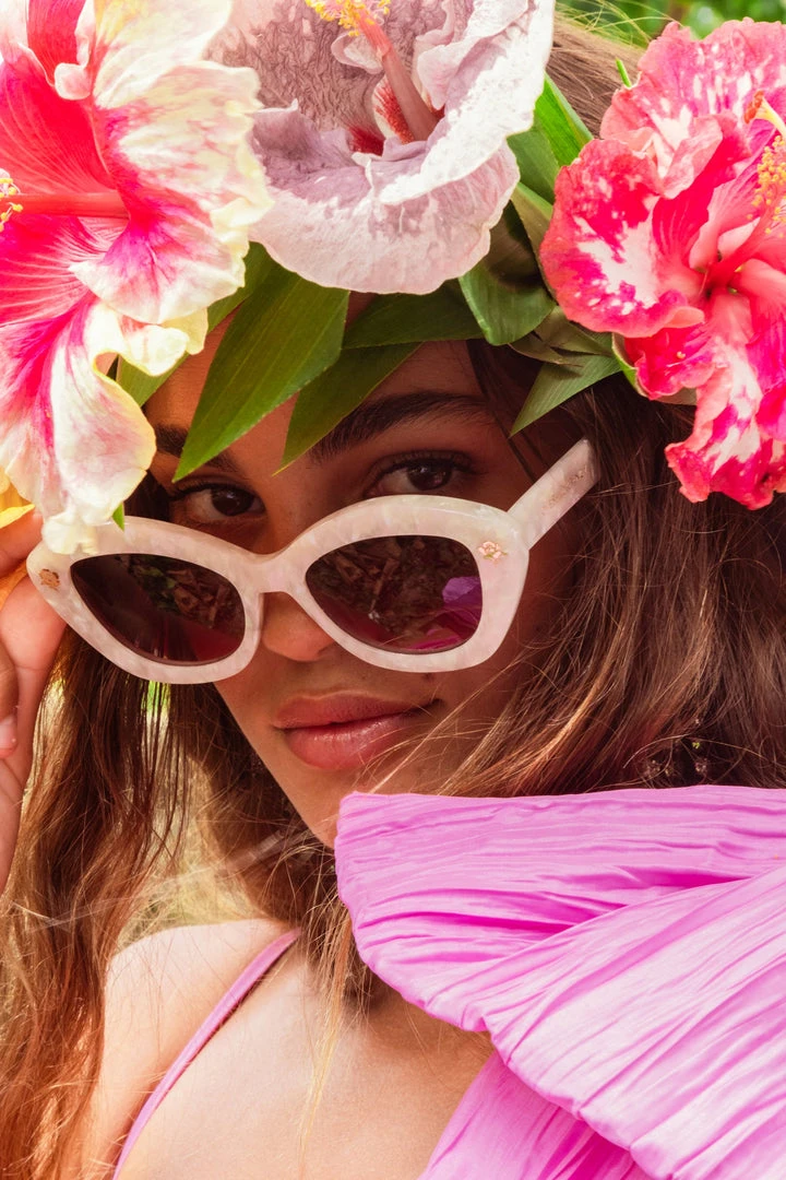 Having a dream girl moment in our Hessel sunglasses. These modern, round cat eye frames add a glossy finish to any look. Wear them with our Tibbie Swimsuit.