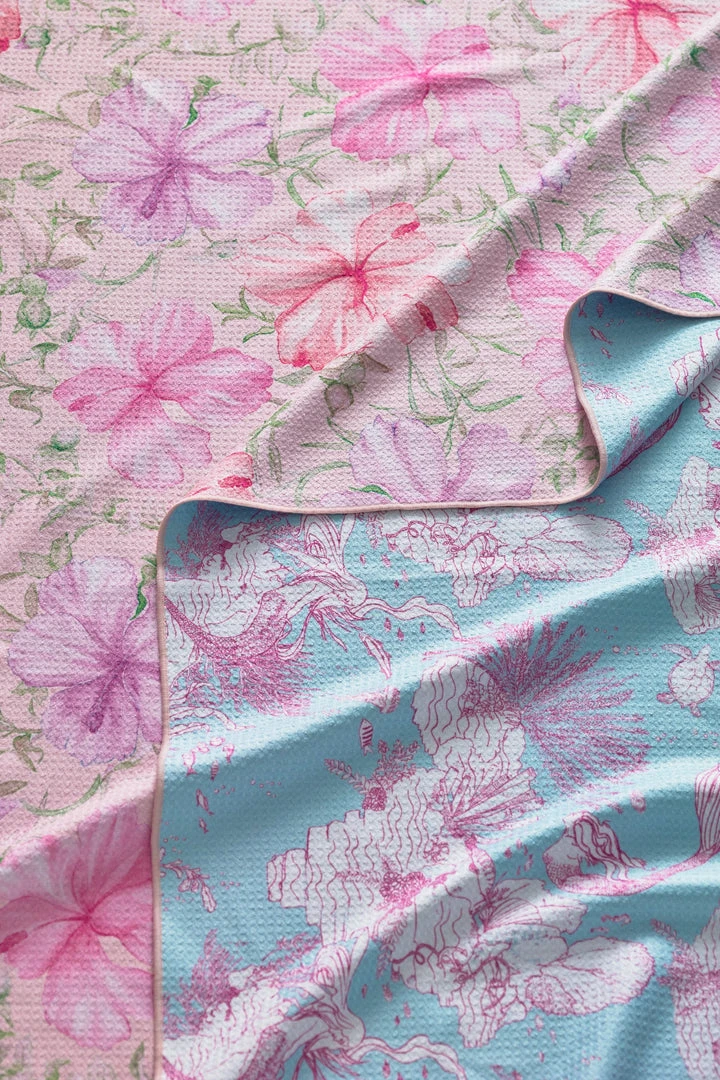 Dry off and lay out with the LoveShackFancy x Hurley Under The Sea Rectangle Towel. This two-sided towel features a playful aqua-colored mermaid print on one side and a bright pink and purple hibiscus print on the opposite. Pair your towel with our LoveShackFancy x Hurley One Piece Swimsuit.