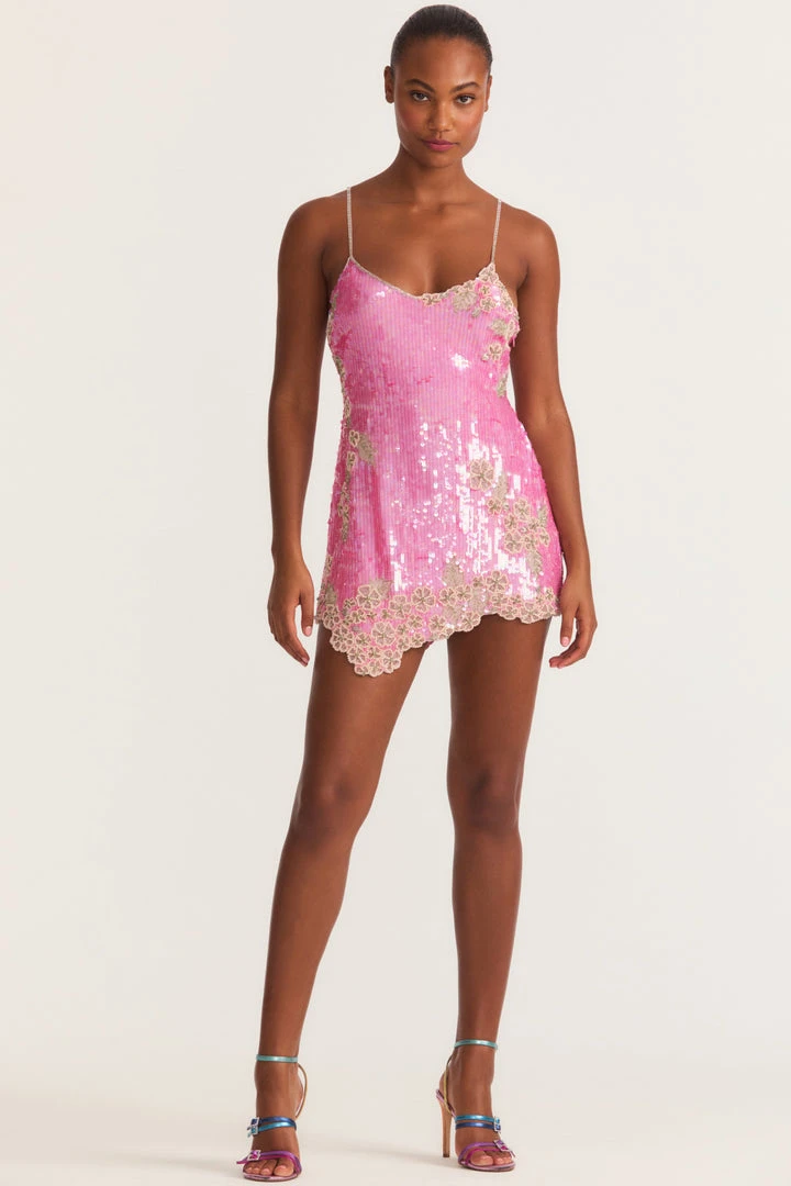 Feeling flirty in our new Meline Dress. This major mini turns heads with hand-embellished floral hibiscus, fishtail sequins with iridescent pearls adorned throughout. Featuring functional straps and a playful asymmetrical hem.