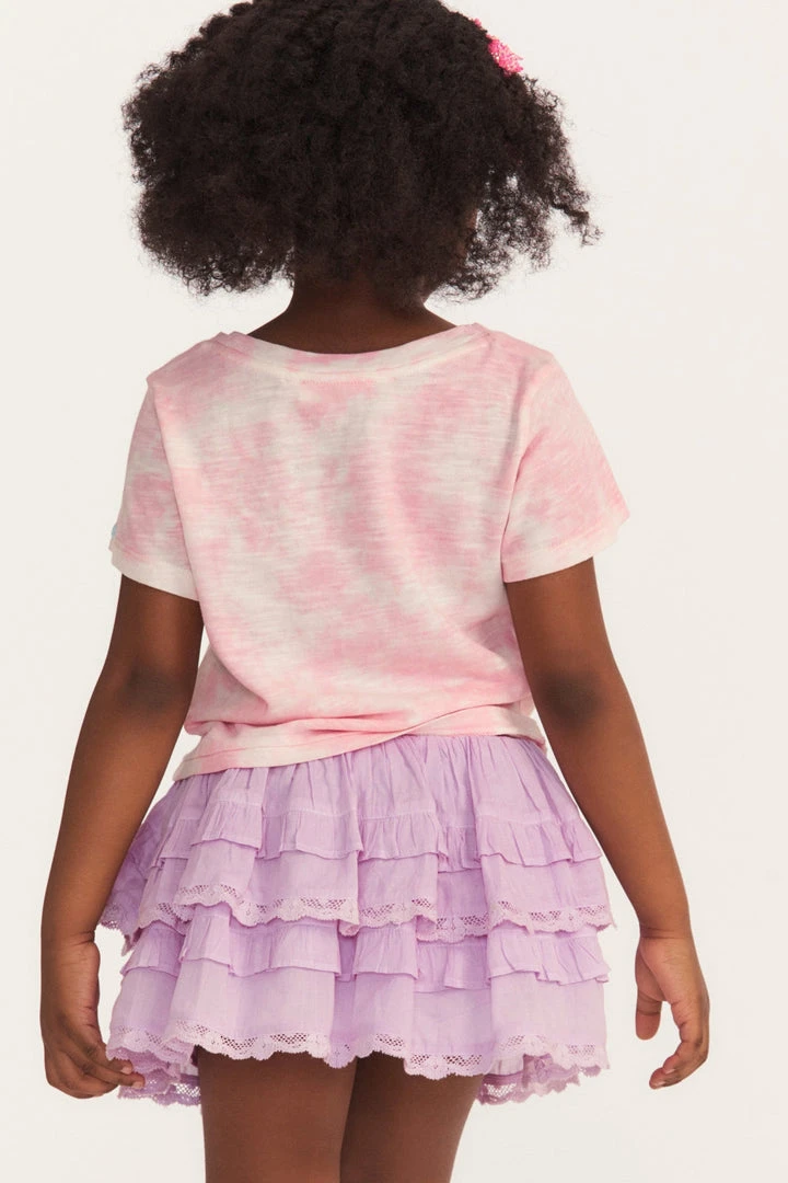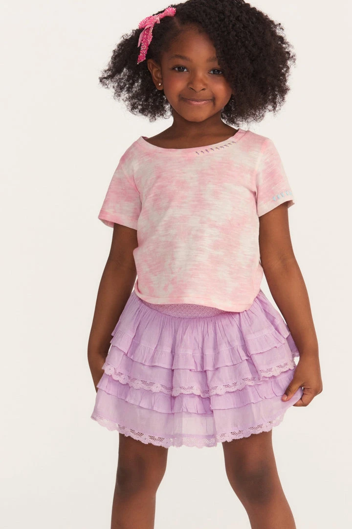 Our beloved Billie Skirt is reimagined in 100% cotton. Below a wide smocked waistband, the skirt falls to two shirred tiers with ruffle details. Pair it with our Girls Mini Rubin Tee. Shown here in Wisteria.