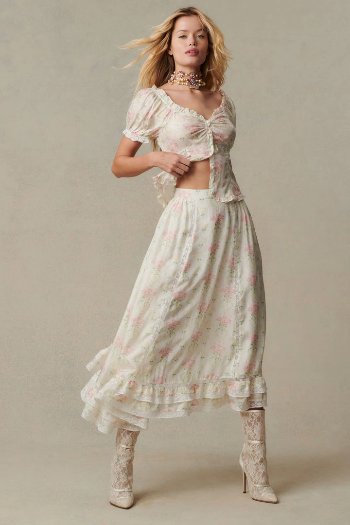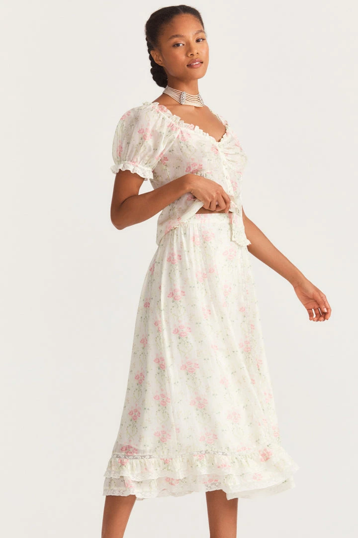 Our Navya Skirt is everything flowy, floral, and fun. Featuring custom lace insets, level skirt detailing, and darling baby pink rose blooms, this mid-length skirt is a must-have for summer to fall. A fixed waist and shaped skirt meets a side seam zipper for comfortable closure. Complete the set with our Bryant Top. Shown here in Baby Pink Dreams.