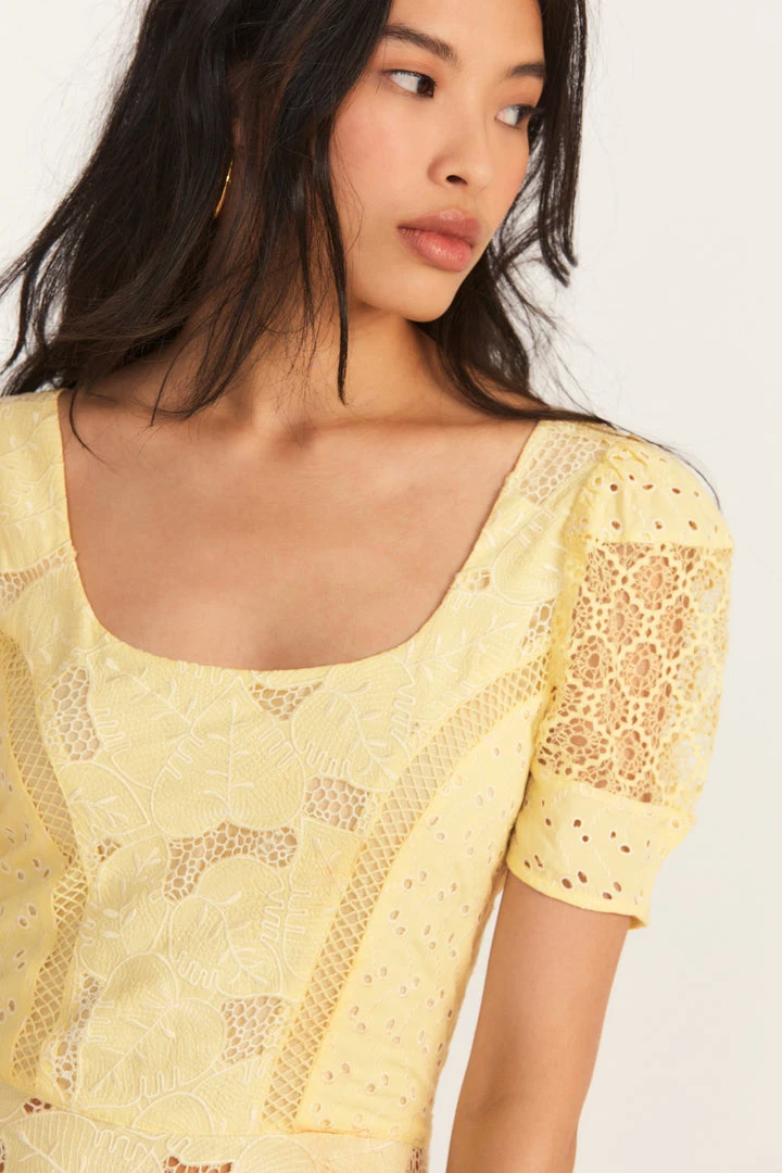 Walking on sunshine in our new Nella Dress. Our Victorian maxi shines in a combination of paneling with eyelet embroidery and custom, palm cutwork fabric. She begins with a low scoop neck and features delicate, lace sleeves. A lace inset adorns the bodice while lining is included. Accessorize it with our LSF x Lova Heart Beige Lace Fringe Earring. Shown here in Lemon Sun.