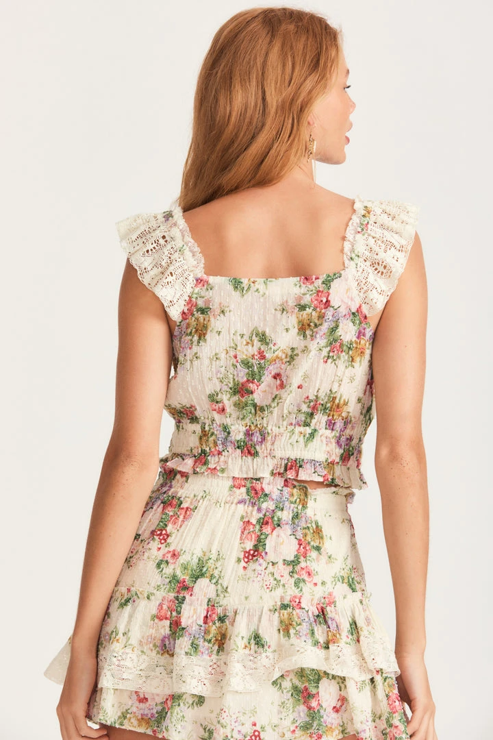 Our Drea Crop Top is the perfect summer to fall transitional top in our hero print of the season; a French textile-inspired floral Victorian, a favorite of our Creative Director’s Rebcca Hessel Cohen. This 100% cotton piece debuts in a clip dot fabric featuring custom laces and hand blanket stitching with a round, feminine neckline, short flutter sleeves and a double elastic tunnel. Pair it with our Viva Midi Skirt.