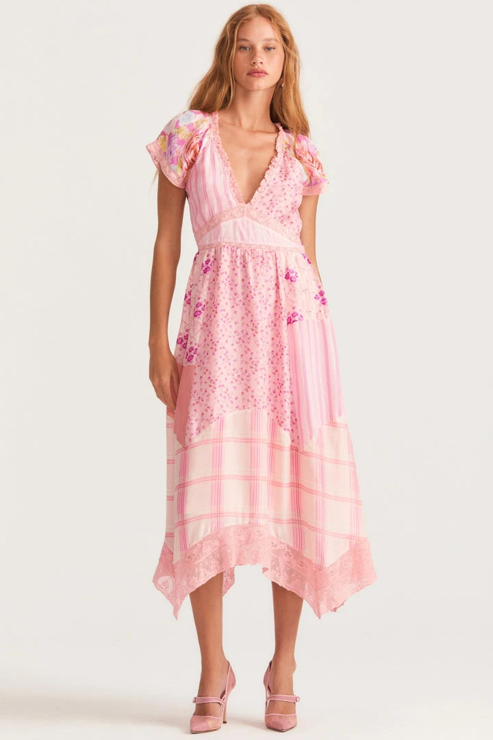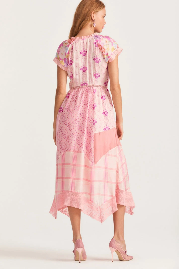 Life’s a dream in our new Tula Dress. Pretty in pink, this charming patchwork frock debuts in a playful plaid and pinstripe print combination. Intricate custom lace frames a shaped waist yolk before falling to a handkerchief hem with edged stitch lace. This piece features short flutter sleeves for a daytime feel and includes easy side seam pockets for functionality. Accessorize it with our Hessel Sunglasses. Shown here in Pink Sand Desert Print Mix.