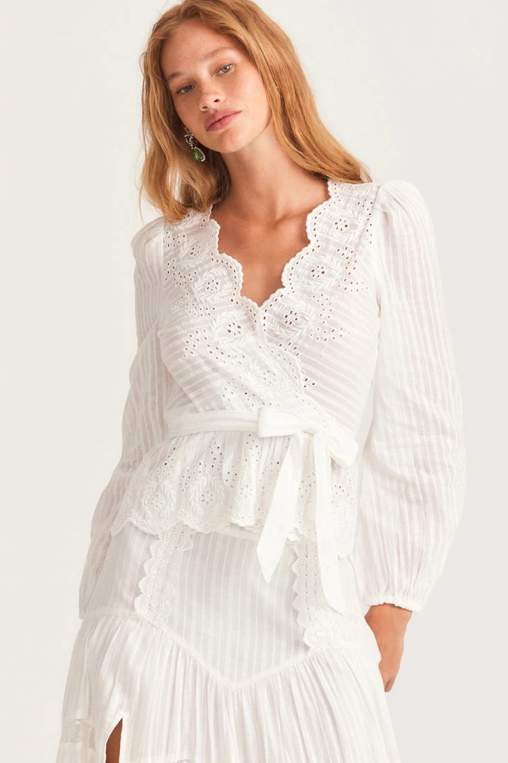 A timeless must-have, our Polla Wrap Top is our newest Victorian to love. Classic in all the right ways, this functional wrap blouse features custom schiffley embroidery, pretty scalloping around a slight v-neckline, and long sleeves with custom lace insets and encased elastic at the opening. Wear it as a set with our Meyer Midi Skirt. Shown here in True White.