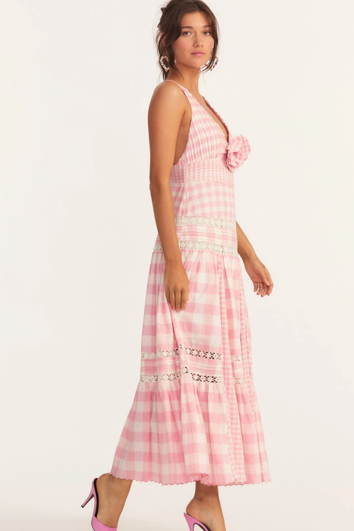 Serving up all the summertime vibes in our new Roan Dress in our Lido Check Cotton. This maxi dress features a three-scaled mix of yarn-dyed cotton with micro and medium checks, scalloping, a removable floral pin and custom embroidery with lacing. The haltered frock falls into a full, contrasting sweep, with a button crossed in the back and functional adjustable straps. Accessorize this with our LSF x Sophia Webster Alba Midi Sandal. Shown here in Groovy Pink.