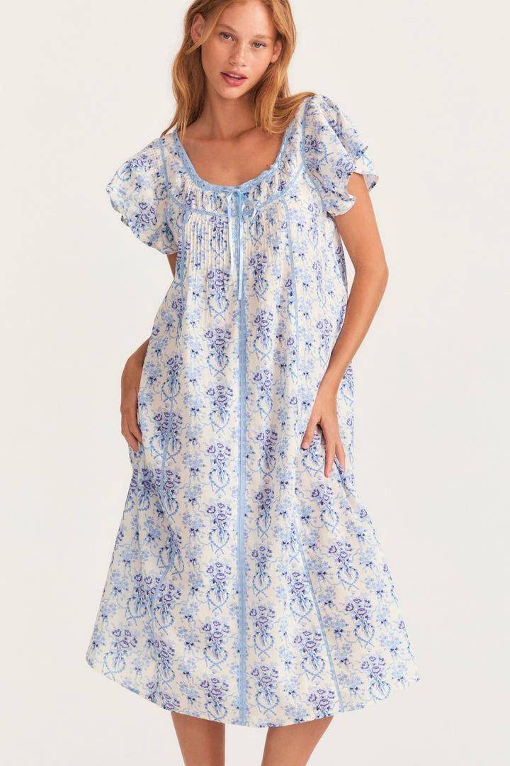 Our Sashi Dress returns in pure cotton in our hero print of the season, a tossed bouquet. The scoop neck and flutter sleeves of this midi- length shift nightgown are trimmed with custom lace. A delicate ribbon drawcord is tied in a bow at center. A second lace is inset across the bodice—alongside shirring and pintucking details—and down the princess and center seams to the finished bottom. Wear it with over our Flower Bouquet Knickers. Shown here in Frosted Shores.