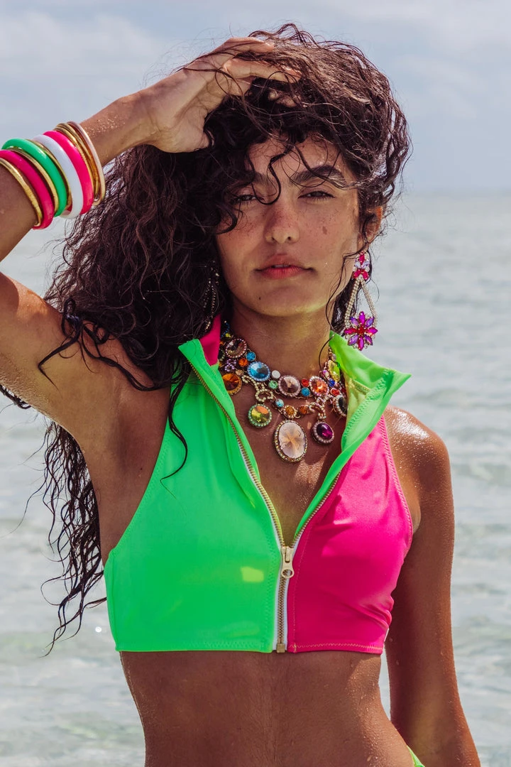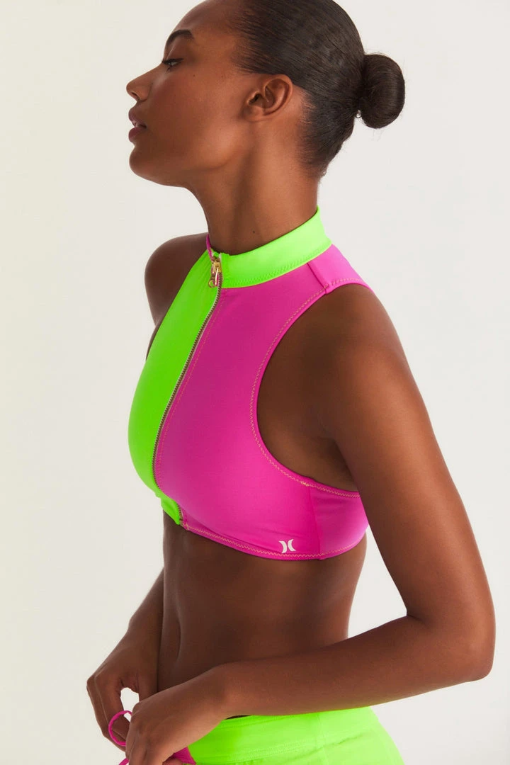 In our surfer girl era with this new LoveShackFancy x Hurley bathing suit top. This epic high neck sleeveless top features vibrant neon color blocking and a center-front zipper for functionality. This racerback features an airy keyhole detail for a playful finish. Pair this swim top with our LoveShackFancy x Hurley Boardie Skirt for a full look. Shown here in Magenta Neon Lime.