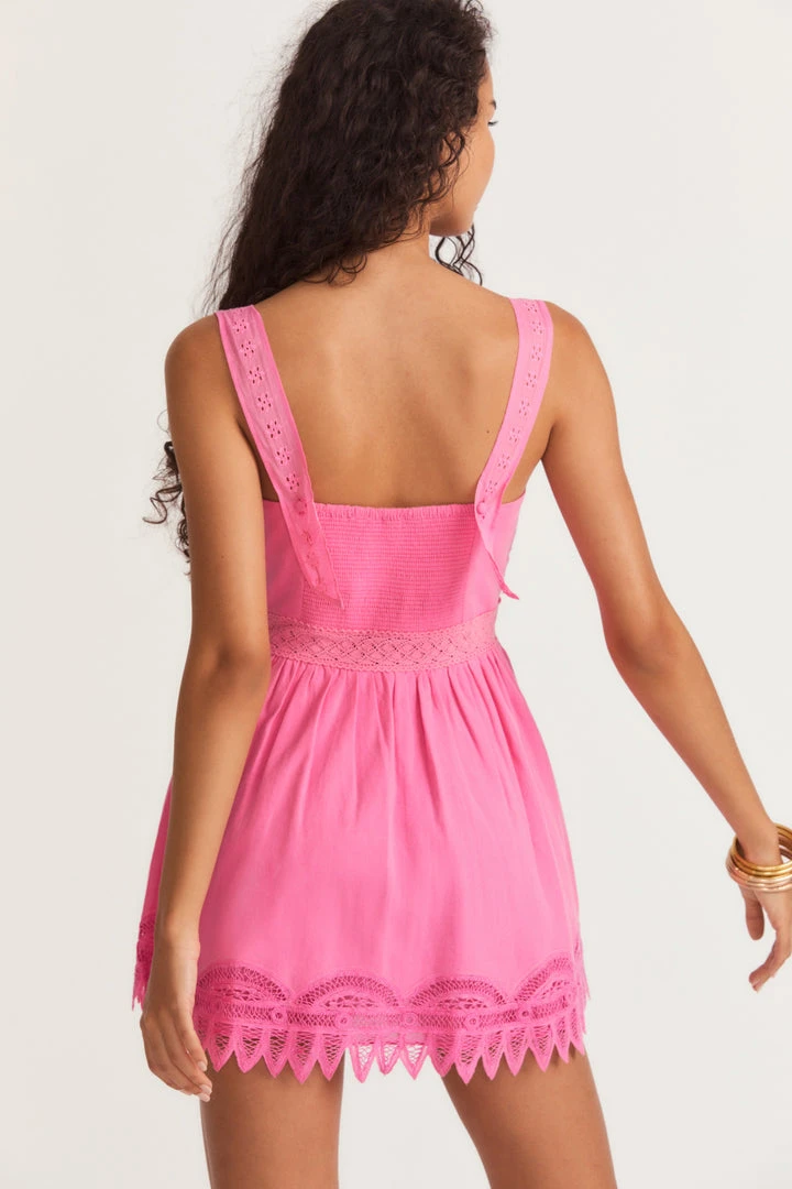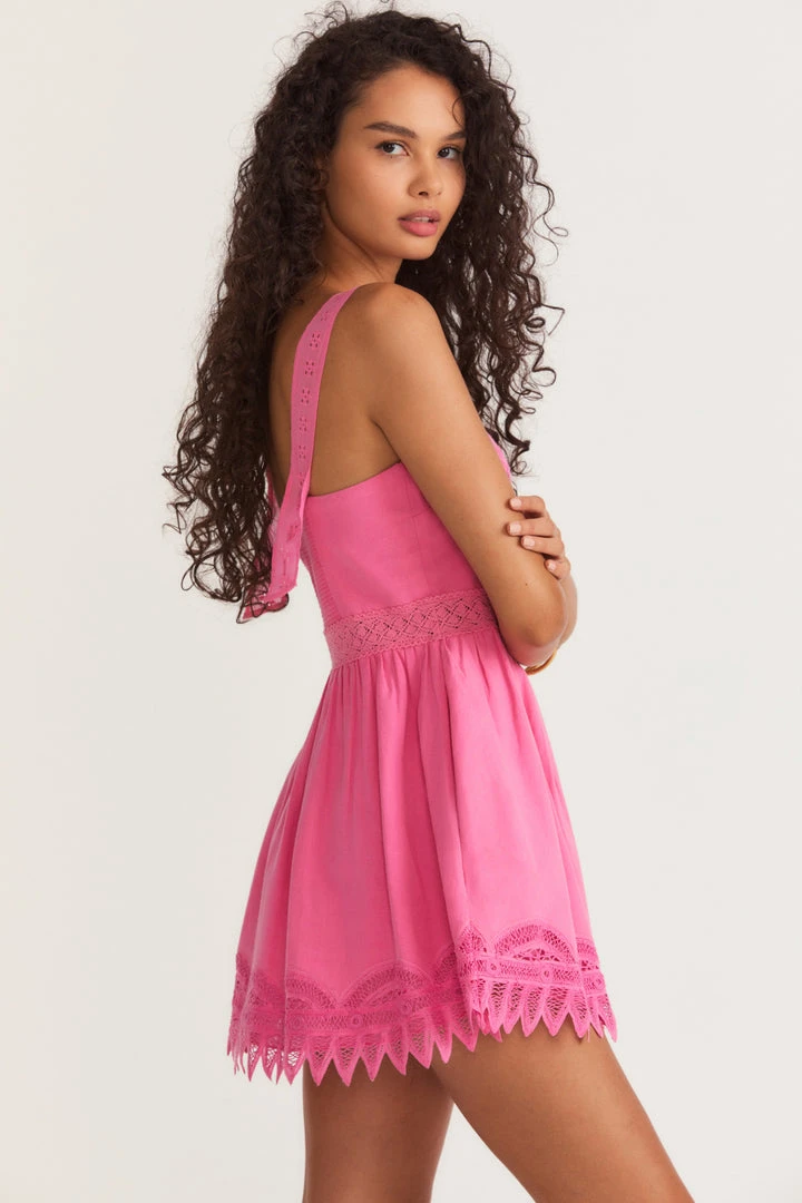 Our new Tariah Pinafore Dress was made for easy, breezy beach days. This airy mini steps onto the scene in a new fabrication with engineered custom battenburg lace. The dress begins with functional, lace-adorned straps fastened onto a square neckline leading to a fixed waist above a lightly ruffled skirt with eyelet embroidery on the trim. The dress includes elastic and a side seam zipper. Accessorize it with our LSF x Sophia Webster Alba Mid Sandal.
