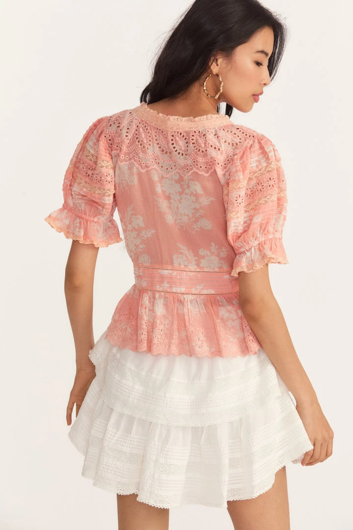The Annalee Top stuns in 100% cotton. This blouse features an intricate, schiffly eyelet detail with custom lace tucking. Short, blossomed sleeves add a touch of delight with a buttoned bodice to the bottom of the top. Pair with our Jimena Skirt or Ruffle Mini Skirt. Shown here in Coral Romance.