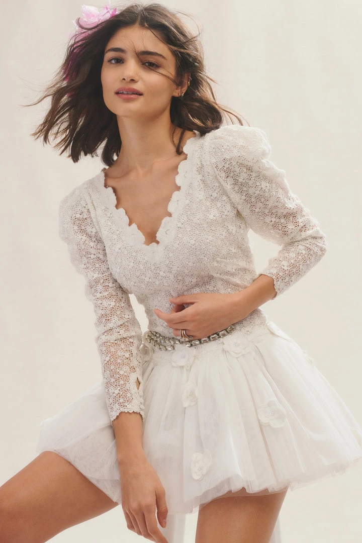 Ready for ‘I Do’ in our Veralynne Dress, a sweet and sophisticated piece for your big day. This made to love minidress features a custom, embroidered lace overlay and floral motif embellishments. A deep v-neck and v-back are framed by sheer puffed ¾-length sleeves with full princess seams and functional buttons. Below a fixed waist is a full, tulle skirt with flower appliques and iridescent buttons. Accessorize it with our LSF x Lova Dolce Vita Heart Flower Earring. Shown here in True White.